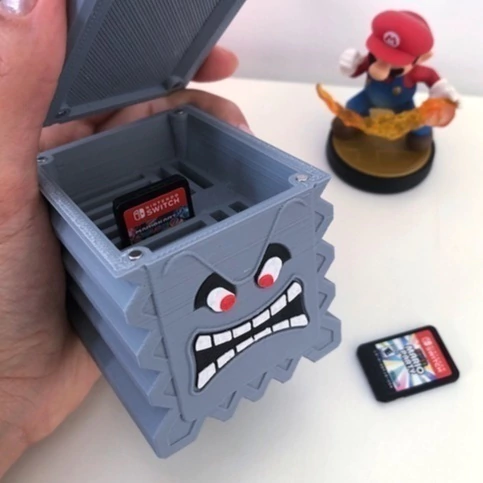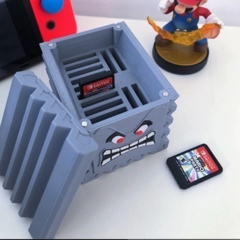 Este case inspirado no personagem Thwomp, clássico do universo Super Mario Bros., é perfeito para guardar suas fitas de Nintendo Switch com personalidade e estilo retrô.